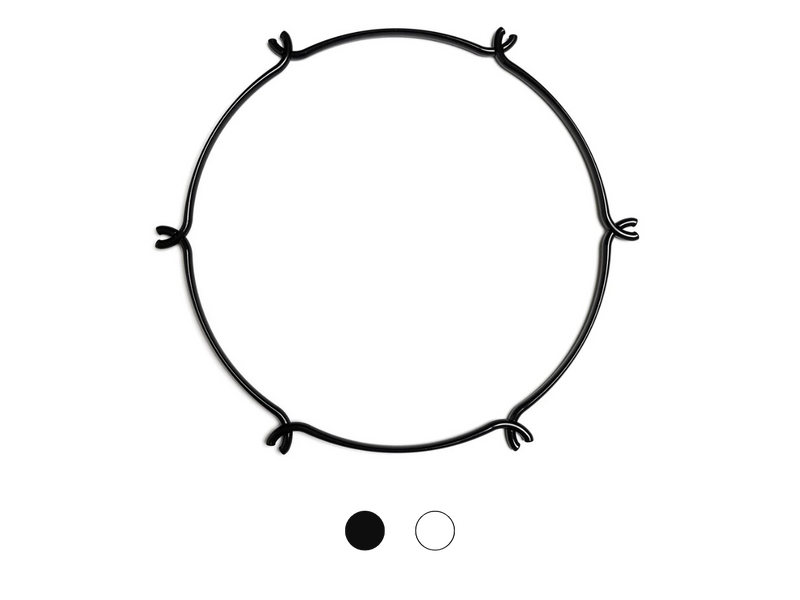 “Cage se compone a partir de anillos redondos o cuadrados, cada uno disponible en dos tamaños diferentes, en acabados blanco o negro de polímero reciclado o transparente de policarbonato, que combinados con los cables y las bombillas deseadas permiten crear auténticas esculturas suspendidas.”